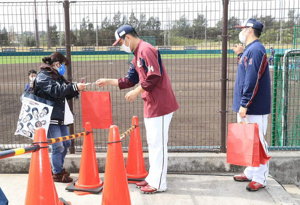 楽天の1軍キャンプ地(沖縄県金武町)で7日、サプライズでのファンサービスが実施された。整理券を配布した上で、抽選に当選したファン4人に直筆サイン入りキャップがプレゼントされた。