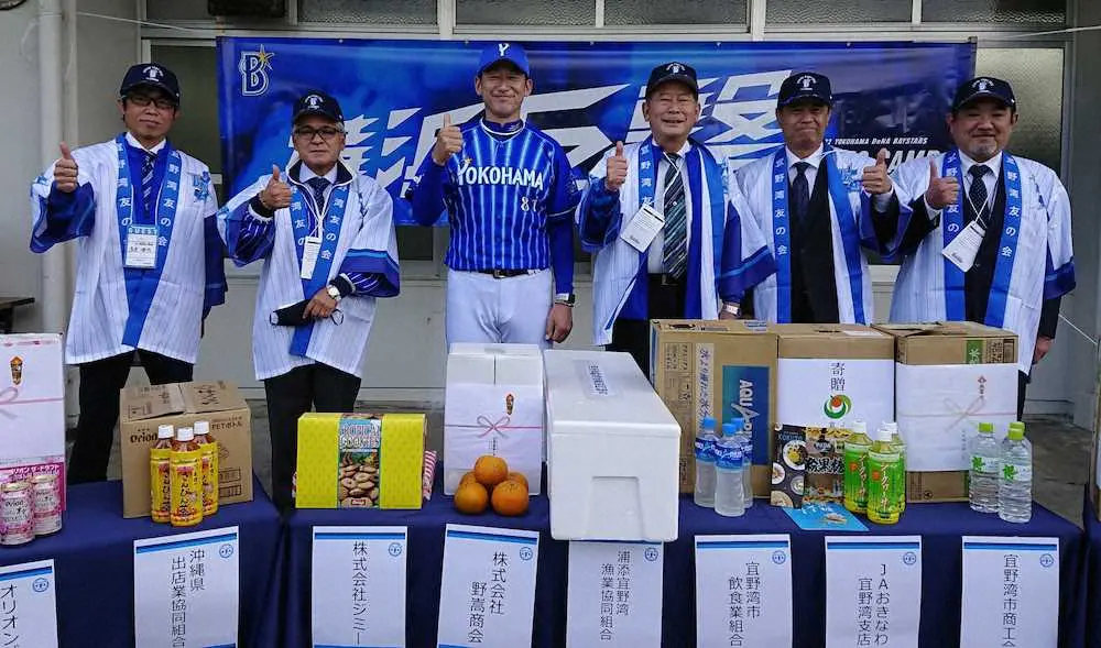 式には三浦大輔監督も出席。同市など16団体から激励品などが贈呈され、中には浦添宜野湾漁業協同組合からの「セーイカ」10キロなども含まれていた。