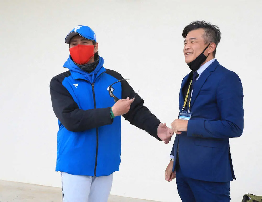 <日本ハムキャンプ>前田氏(右)と談笑する新庄監督(撮影・西川 祐介)