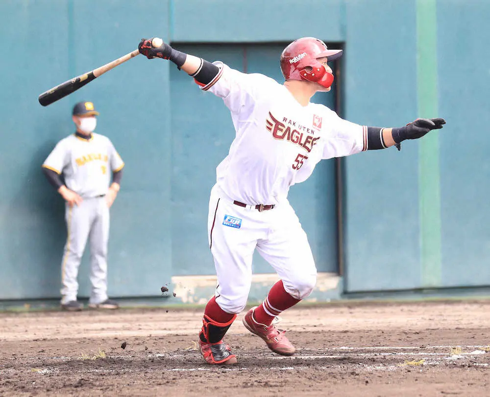 ≪田中和135メートル特大弾≫田中和がスコアボードを破壊する推定135メートルの特大弾を放った。2回に右中間ソロを放つと4回、藤浪の151キロ直球を捉えた打球は中堅上部の電光掲示板を直撃し、直後から楽天の得点表示が消えた状態に。「あそこまで飛ぶとは。いろいろな方から“弁償しろ、弁償しろ”と言われて…。早く直ってほしい」と苦笑い。外野は島内、岡島、辰己、新加入の西川、新外国人のマルモレホスら激戦区ながら、最高のアピールになった。