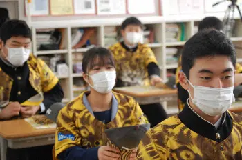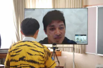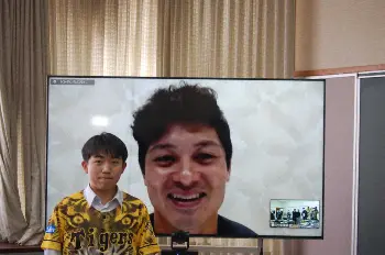 <阪神キャンプ>オンライン講演会で坂本と交流する養父中の生徒たち(養父中提供)