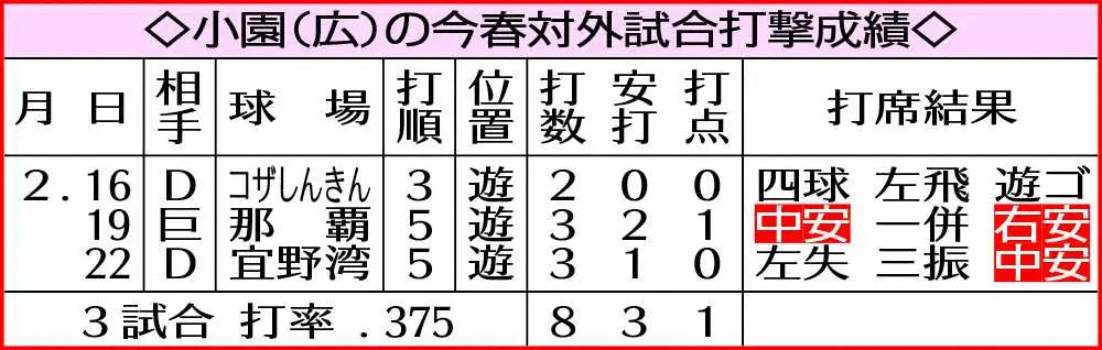 <広島キャンプ>「ダッシュ行きます」と右手を上げる小園(撮影・奥 調) Photo by スポニチ 広島得点力アップへ“小園5番構想” 東出コーチ「走者を還す能力高いし、三… ギャラリーで見る この記事のフォト 2022年02月24日の画像一覧 もっと見る 2022年02月24日の画像をもっと見る