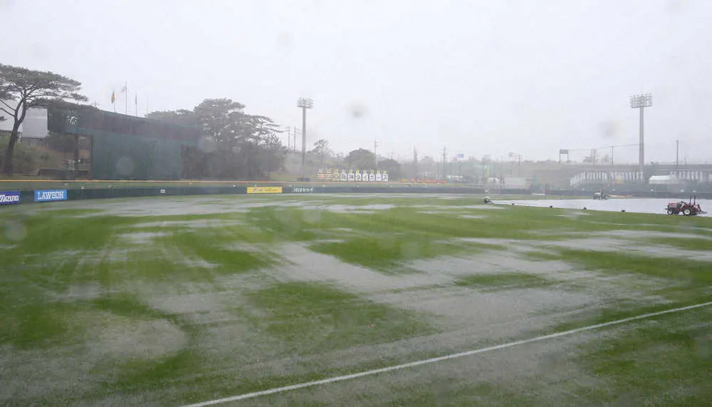 すっきりしない天気が続く今年の宜野座だが、この日は今キャンプ一番の大雨。朝、起きた時点で広島戦の中止は覚悟した。