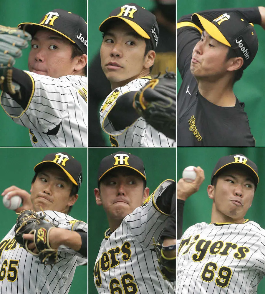 24日の阪神・紅白戦に登板する(上段左から)村上、小野、浜地、(下段同)湯浅、小川、石井