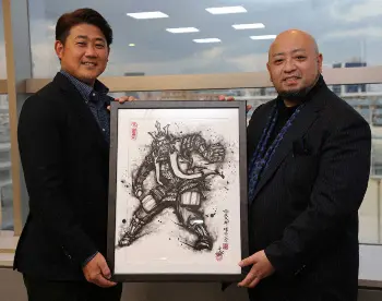 2人が実際に顔を合わせるのは初めて。松坂氏側から、引退する際にお世話になった人へ送るものに、何か喜んでもらえるものはないかと考え、こうじょう氏に依頼した。その作品2点が、こうじょう氏から、松坂氏へ手渡された。