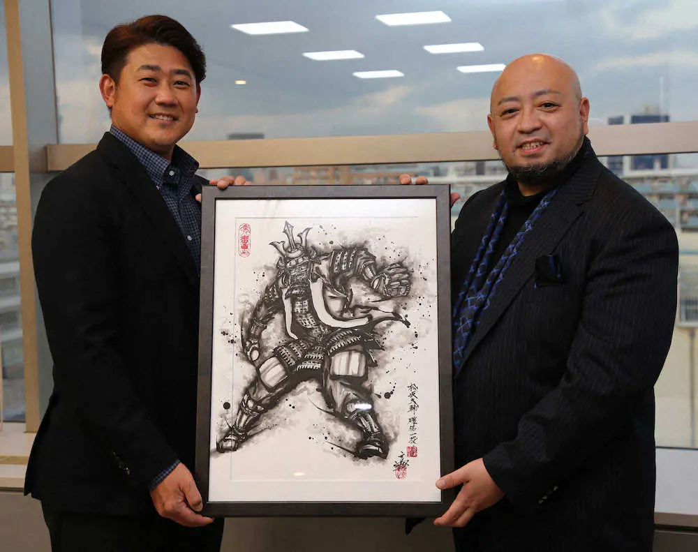 松坂大輔氏(41)が武人になった──。スポニチ本紙評論家を務める松坂氏が引退記念にと、京都出身の水墨画家で「武人画師」としても知られる、こうじょう雅之氏(43)に依頼した「武人画」が完成。2枚の作品が松坂氏に手渡されるとともに、「野球人」と「画家」による異色の対談が行われた。
