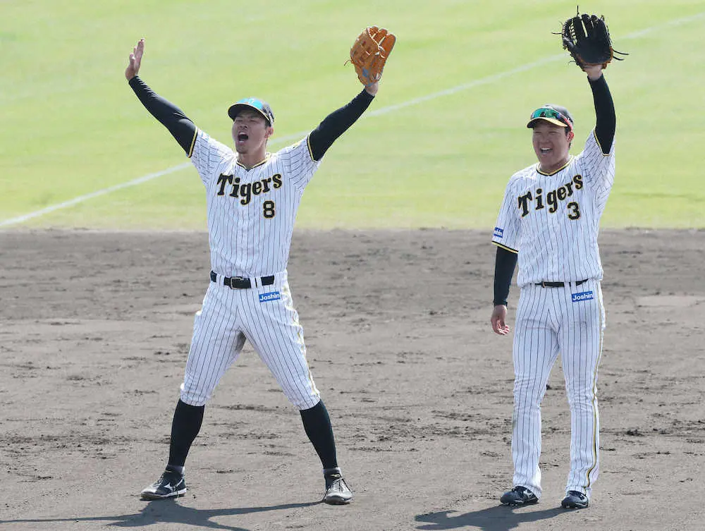 阪神・大山(右)と佐藤輝