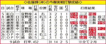 注目の大山との4番争い。大山の今春実戦は9試合で打率・292(24打数7安打)、1本塁打、3打点で、4番5試合では打率・214(14打数3安打)、本塁打、打点はゼロ。対する「4番・佐藤輝」は6試合で打率・550(20打数11安打)、2本塁打、3打点と一歩リードする。矢野監督からも「結果を出しているところで言えば、輝の方が結果が出ている現状」と評価を受けた。4番、そして三塁を任されるためには、さらなるアピールあるのみ。本人も当然、そのつもりだ。
