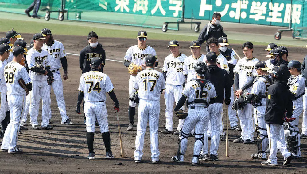 投内連係の練習後に井上ヘッドコーチの話を聞く阪神ナイン(撮影・大森 寛明)