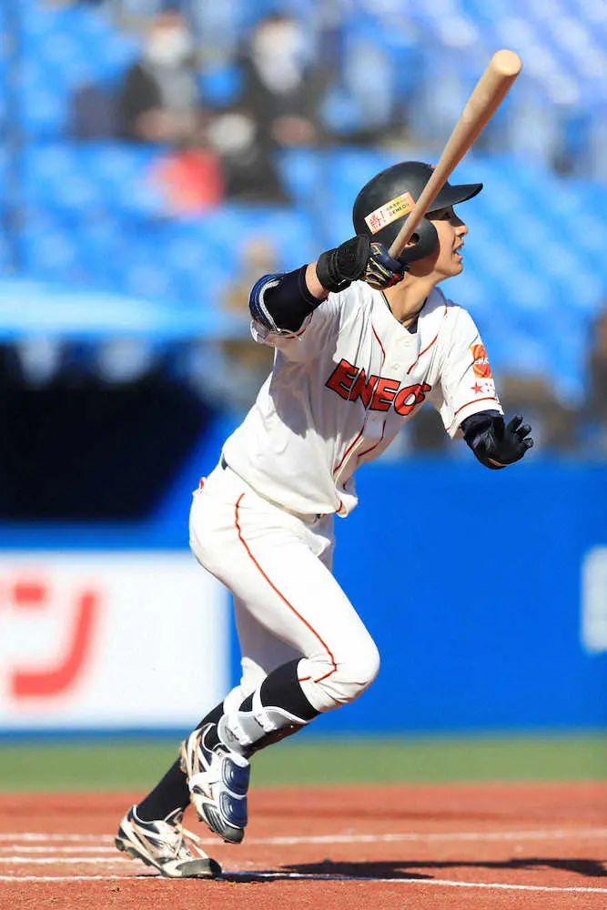 ENEOSの高卒2年目・度会隆輝外野手(19、横浜)は三菱自動車倉敷オーシャンズとの開幕戦(神宮)に「1番・右翼」で出場。先発左腕・末野雄大(23、関西国際大)から、右越えに先頭打者本塁打を放った。