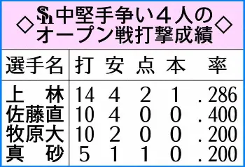 開幕メンバーの振り分けを10日までと設定する指揮官は「競争している人は宇部で打席数を増やせる。8日は若手の最後の本当の競争と思ってくれたら」と競争心をあおった。