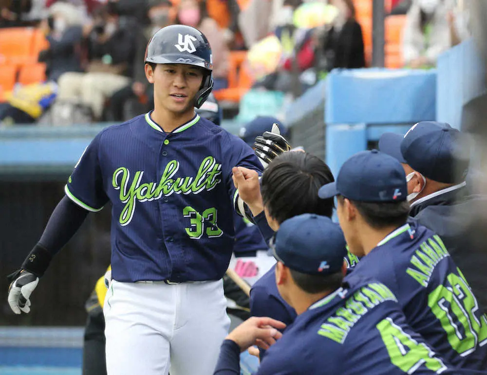 0―1の6回2死、代打で登場。酒居の134キロ直球を捉え左翼席へ運んだ。高津監督が若手のアピール不足を嘆く中、19歳がチームのオープン戦1号アーチ。高校通算34本塁打を放った打棒で、チーム30イニングぶりの得点をもたらした。