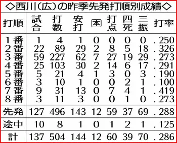 広島・西川の昨季先発打順別成績 Photo by スポニチ 広島・西川龍馬「1番」で上沢撃ち3安打 佐々岡監督も「出塁率は武器」と… ギャラリーで見る この記事のフォト 2022年03月13日の画像一覧 もっと見る 2022年03月13日の画像をもっと見る