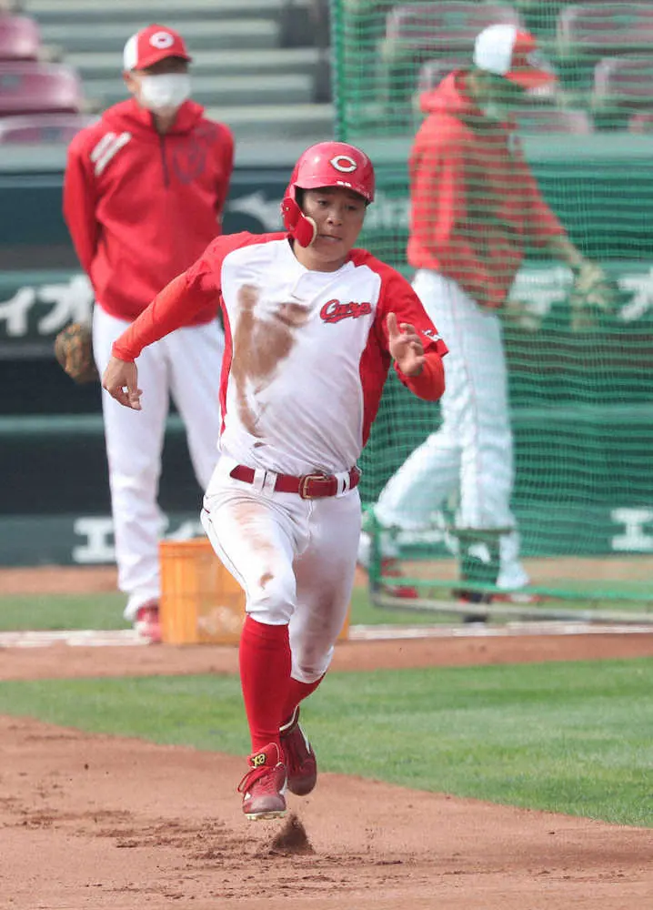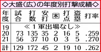 足場固めに精を出した。千葉への移動を控えた14日午前、大盛は前日13日の日本ハム戦で失敗した野間とともに、マツダスタジアムに隣接する屋内練習場でバント練習に取り組んだ。東出野手総合コーチの指示だった。