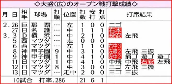広島・大盛穂外野手(25)が4年目で初の開幕スタメンを視界に捉えている。ここまでオープン戦10試合に出場し、打率・286。出番が限られていた中で結果を残し、最近(8~12日)は4試合で先発するなど、首脳陣は評価を上方修正する。15日のロッテ戦(ZOZOマリン)からの残り5試合がラストスパート。「勝ち取りたい」と力を込めた。