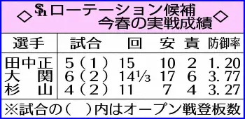 開幕ローテーション最後の切符をめぐる戦いは、オープン戦の最終ゲームで決着することになった。最終候補に残った田中正、大関、杉山の3人が20日の日曜日、広島戦(マツダ)に登板。その結果を見て1週間後の開幕第3戦、27日の日本ハム戦に先発する投手が決まる。