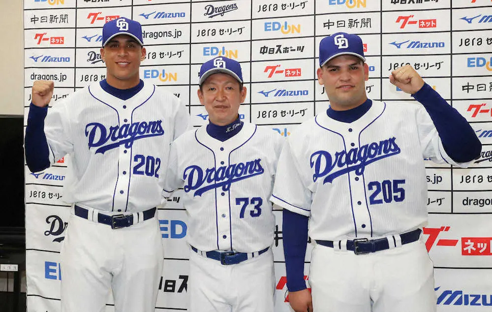 会見に同席した立浪監督は「アルバレスは球が速いし、ガルシアは非常にバットの使い方が柔らかい印象。近い将来、活躍できる選手になってもらいたい。焦らずにじっくりやってほしい」と期待を寄せた。