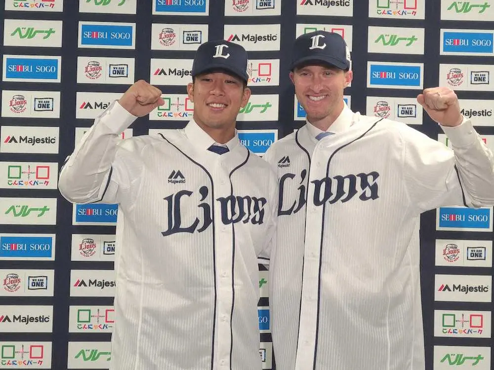 西武の新外国人であるジャンセン・ウィティ内野手(32)、ボー・タカハシ投手(25)が18日、ベルーナドームに隣接する球団施設で入団会見を行った。