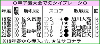 ≪選抜史上2度目≫大会2日目の近江―長崎日大は延長12回までに決着が付かず、選抜史上2度目のタイブレークに突入した。タイブレークは選手の健康管理や大会日程の円滑な消化などの観点から早期決着を促すべく、13回から無死一、二塁の状況で始める。決着がつくまで続行されるが、1投手が登板できるのは15イニングまで。18年の選抜から導入され、春夏の甲子園大会では通算5度目の適用。
