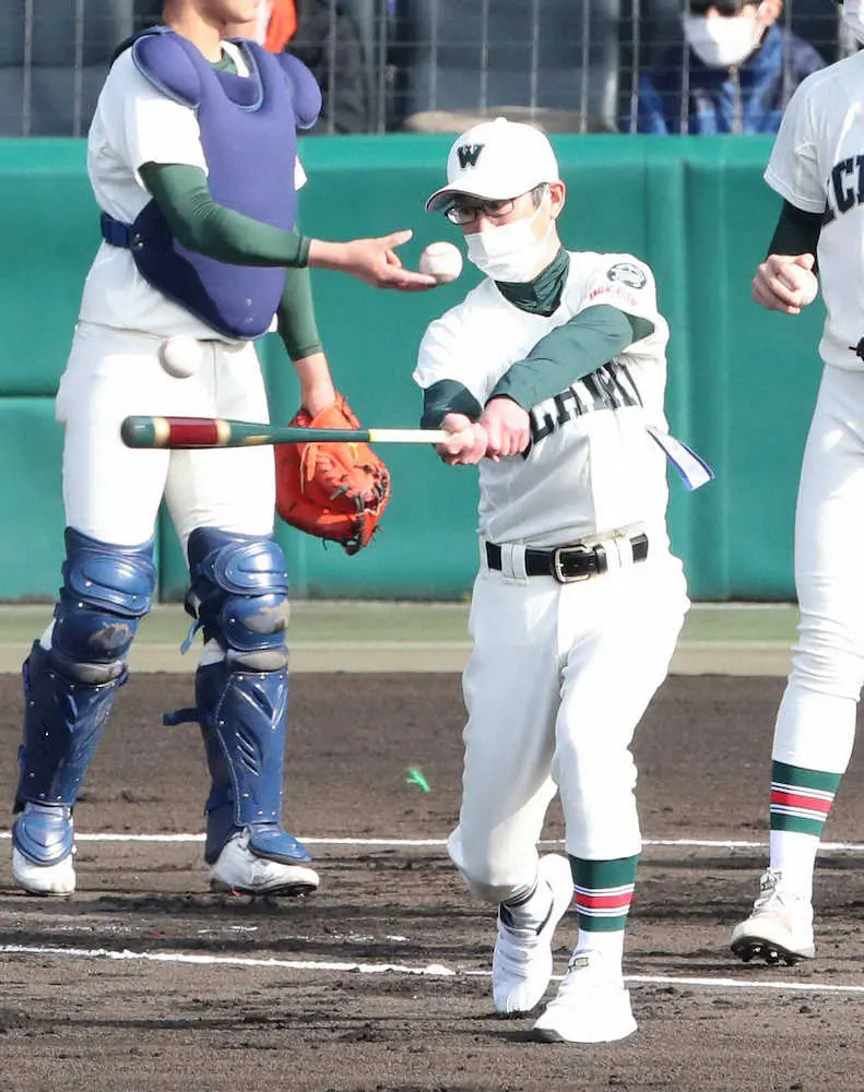 <市和歌山・花巻東>試合前練習でノックする市和歌山・半田監督(撮影・成瀬 徹)