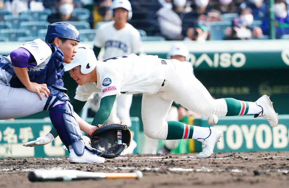 <市和歌山・花巻東>2回一死三塁、和歌山・田島の右犠飛で三塁走者・寺田が同点の生還(捕手・田代)(撮影・井垣 忠夫)
