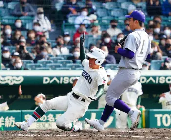 <市和歌山・花巻東>3回1死二、三塁、花巻東・万谷の暴投で市和歌山の三塁走者・白木が勝ち越しの生還(撮影・井垣 忠夫)