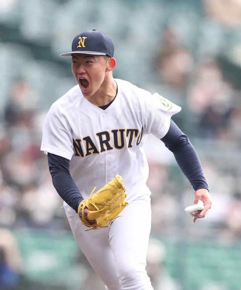 <大阪桐蔭・鳴門>5回2死二塁、大阪桐蔭・海老根を空振り三振に抑え、雄叫びをあげる鳴門・冨田(撮影・坂田 高浩)