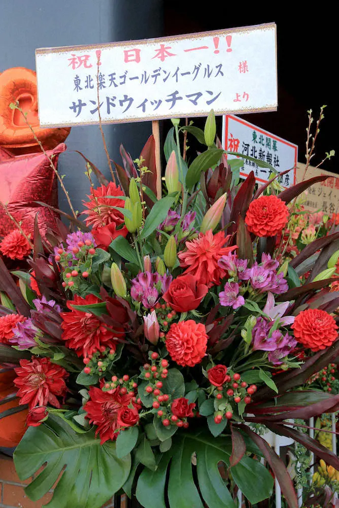 楽天「祝!日本一!!」サンドウィッチマンが一足早い祝福と激励の花