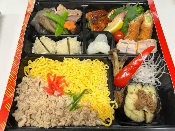 辻監督の故郷・佐賀県発祥の「烏賊焼売」や、「九州の筑前煮」のほか、「鰻蒲焼」や「季節の魚の照り焼き」、「丸茄子の肉味噌サンド」などを取りそろえられている。「丸茄子の肉味噌サンド」は丸茄子との相性を考慮し、旨味の強い牛ひき肉と赤味噌を合わせた神田川俊郎氏特製メニューだ。
