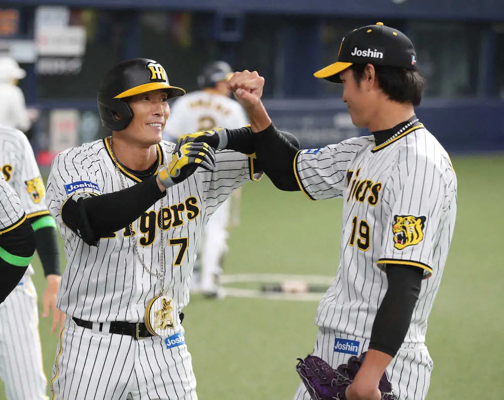 ダイヤモンドを一周すると笑顔のナインが待ち構えていた。ファンから募集した22年最初の虎メダルが小幡から贈呈され、近大の後輩、佐藤輝とは天を見上げて手を突き出す「新ポーズ」も披露。チーム最年長のベテランがチームを勢いづけた。40歳7カ月での開幕戦本塁打は09年金本の41歳0カ月、18年福留の40歳11カ月に次ぐ、球団史上3番目の年長弾となった。