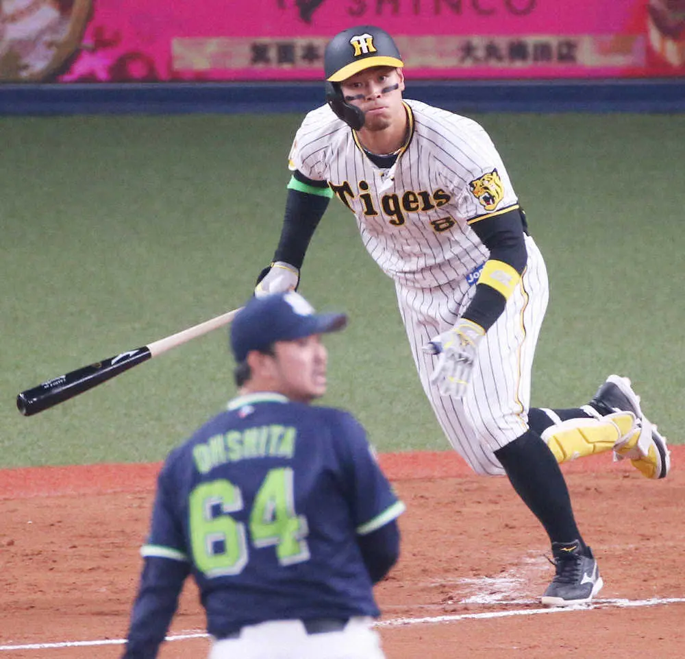 ドラフト制以降では球団最年少となる23歳12日で開幕4番を務めた阪神・佐藤輝は、適時二塁打含む3安打1打点と躍動。それでも2点を追う9回は右飛にたおれ、唇をかみしめた。