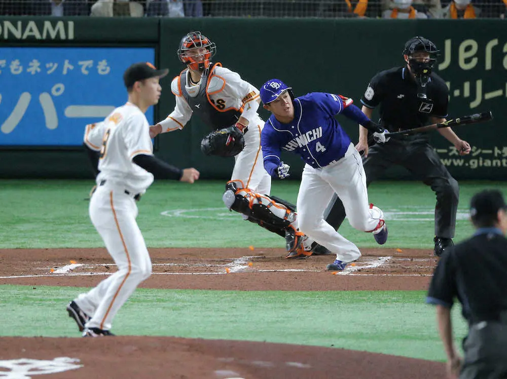 「6番・左翼」でプロ初スタメンを果たすと、2回1死一塁の第1打席で巨人先発・山崎伊の内角シュートをとらえ三塁線へ強烈なゴロの内野安打を放った。抜けるかという打球は三塁・岡本に好捕されたが、懸命に一塁を駆け抜けてセーフ。送球が逸れる間に一気に二塁に進んだ。この一打で二、三塁と好機を拡大すると、続く石川昂の二ゴロの間に三塁走者が生還し、先制点を挙げた。