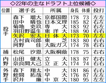 ◇矢沢 宏太(やざわ・こうた)2000年(平12)8月2日生まれ、東京都町田市出身の21歳。藤嶺藤沢(神奈川)では甲子園出場なし。日体大では1年春から外野手で出場し、1年秋から投手として登板。リーグ通算成績は野手では31試合で打率.276、3本塁打、14打点、4盗塁。投手では15試合で7勝4敗、防御率1.59。1メートル73、70キロ。左投げ左打ち。
