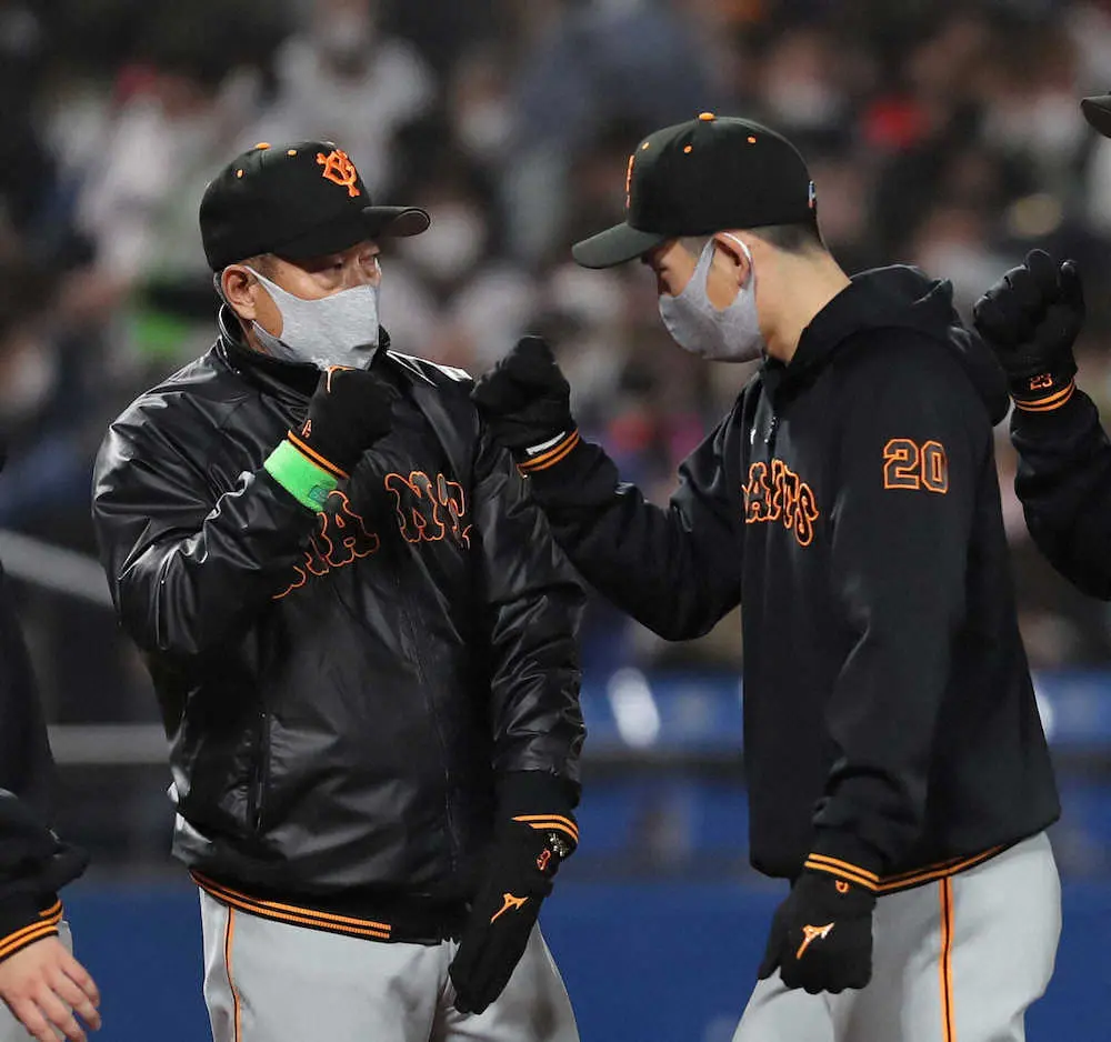 <ヤ・巨(1)>勝利投手の戸郷(右)をグータッチで迎える原監督(撮影・村上 大輔)