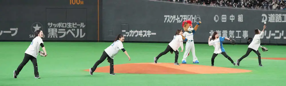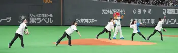 <日・西(2)>ファーストピッチセレモニーを務め新庄監督(中央)らと記念写真に納まるカーリング女子ロコ・ソラーレ (撮影・高橋茂夫) Photo by スポニチ ロコ・ソラーレがファーストピッチセレモニー BIGBOSSが捕手役でプロテク… ギャラリーで見る この記事のフォト 2022年03月30日の画像一覧 もっと見る 2022年03月30日の画像をもっと見る