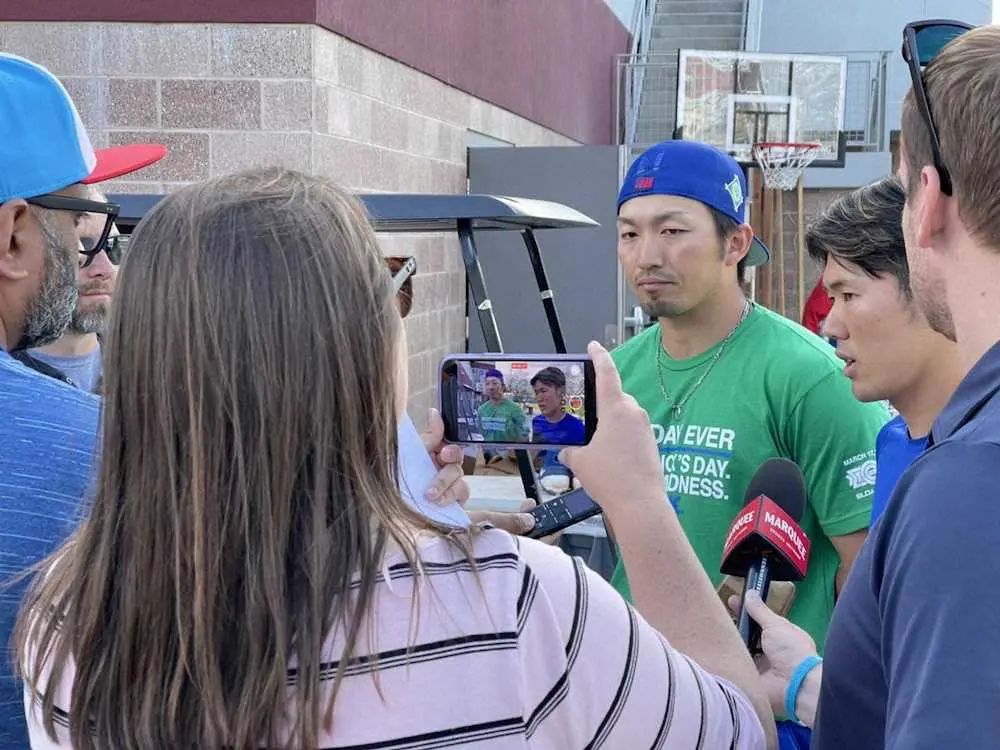 試合後に米メディアから取材を受けるカブス・鈴木(撮影・笹田 幸嗣通信員)