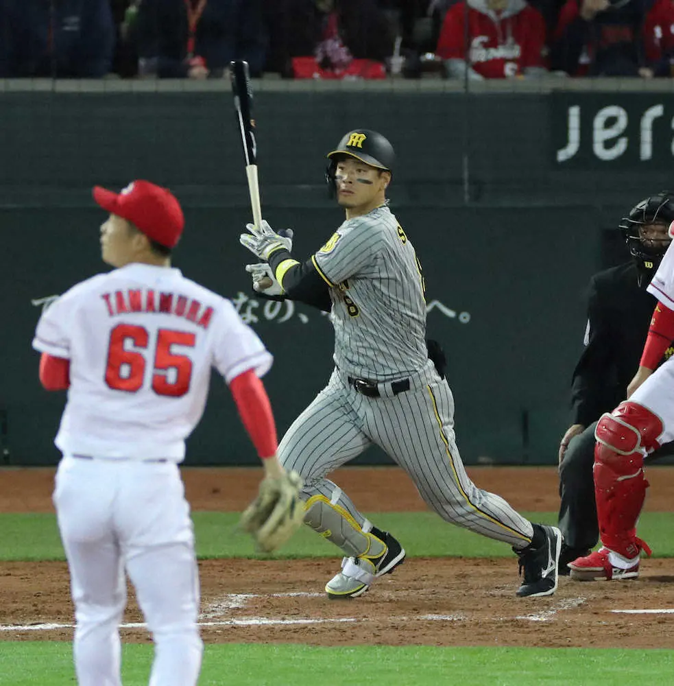 1点優勢の5回、阪神・佐藤輝のバットから快音が響いた。2死二塁で迎えた第3打席に玉村の内角への直球を振り抜いて右翼への適時二塁打。2回に満塁で秋山の遊ゴロの間に奪った1点のみと攻略に苦しんでいた左腕をようやく捉えた。チームは開幕から悪夢の5連敗。中軸として奮起が期待される背番号8が、序盤から力投を続ける秋山にも勇気を与える援護点をプレゼントした。