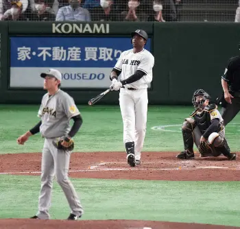 「3番・右翼」で開幕から8試合連続の先発出場。3―2で迎えた3回、1死走者なしで入った第2打席で相手先発右腕・小川が投じた初球、真ん中高め145キロ直球を右翼スタンド上段へ叩き込んだ。打った瞬間、それと分かる特大弾。本塁打を確信したポランコもゆっくりとした動作で着弾を見届けた。
