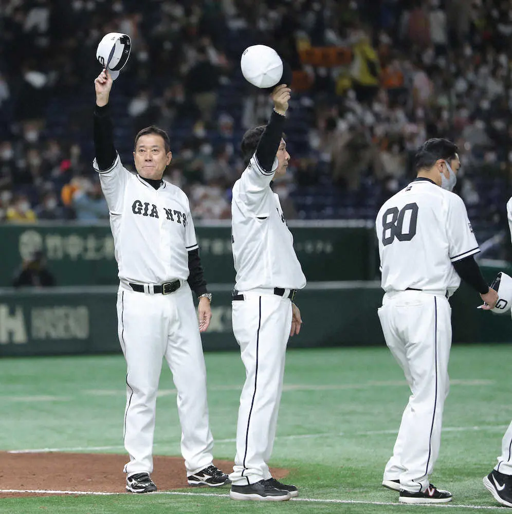 <巨・神>試合に勝利し、観客の拍手に帽子を脱いで応える原監督(左)=撮影・河野 光希
