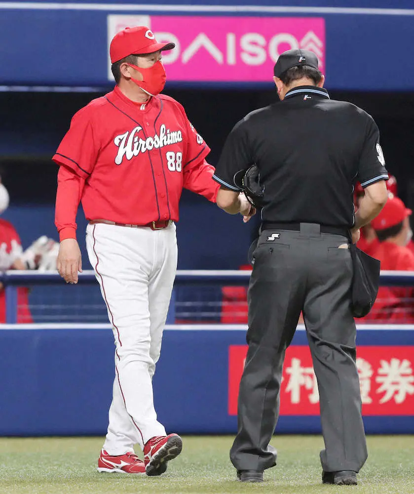 <中・広(3)>交代を告げる佐々岡監督(撮影・椎名 航)
