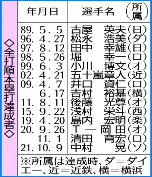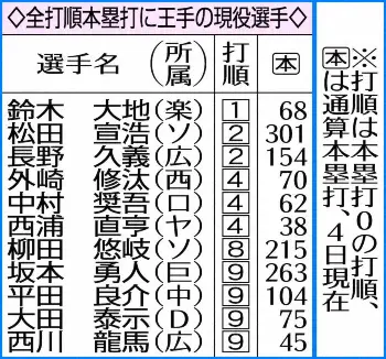 今季は坂本(巨)や柳田(ソ)ら11人が残り1打順としている。坂本は9番、柳田は8番が残っており現状、現実味が低い選手もいるが、鈴木大(楽)の1番や松田(ソ)、長野(広)の2番、外崎(西)の4番などは昨年も起用実績がある。同年に3人以上の達成となれば史上初めてだがどうか。