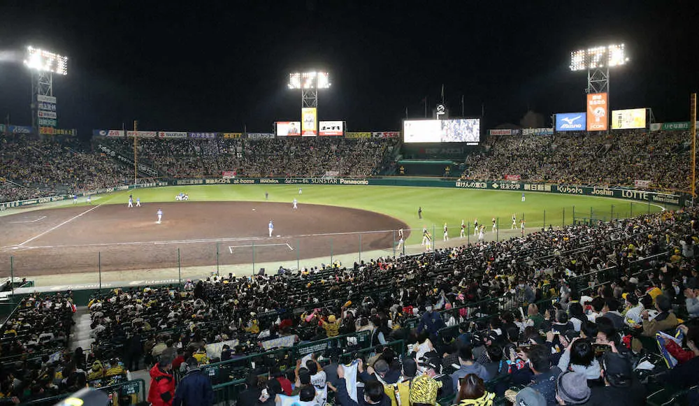 7回の攻撃では今季から導入されたLED照明を使っての演出も実施。コロナ禍でジェット風船を飛ばす恒例の“儀式”は封印されているが、鮮やかな光の演出で聖地を盛り上げた。試合は序盤から佐藤輝の今季1号2ランなどで阪神が4得点し、今季初勝利へ向けて終盤に入った。