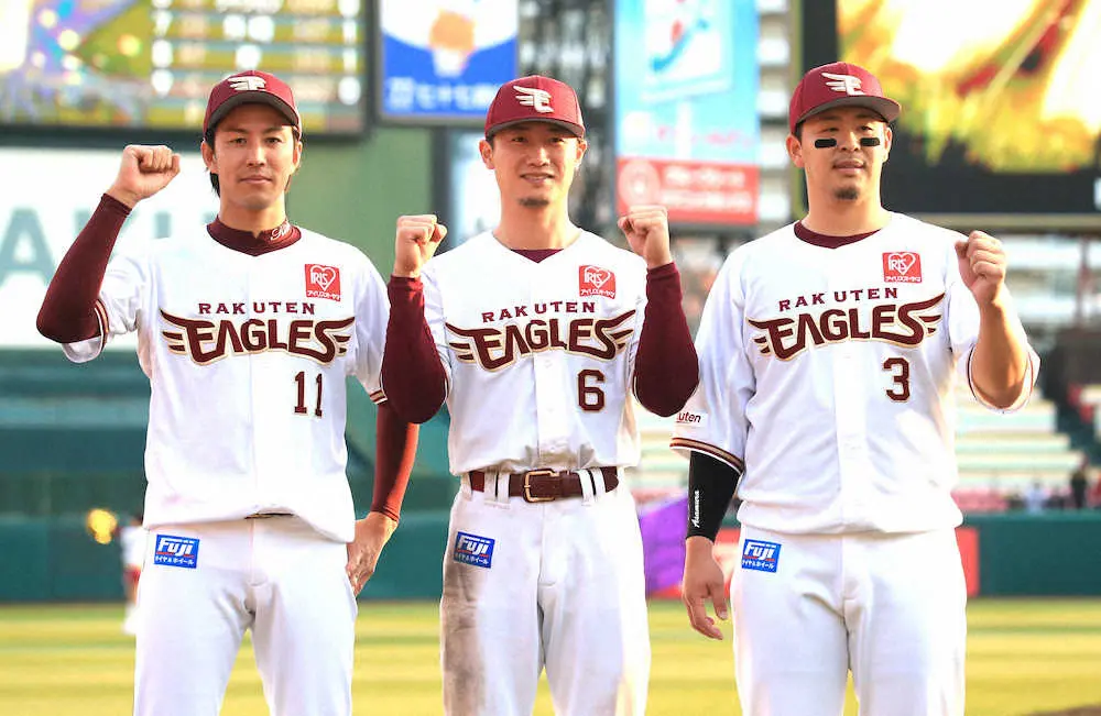 <楽・西>お立ち台の後でガッツポーズをする(左から)岸、西川、浅村(撮影・篠原 岳夫)