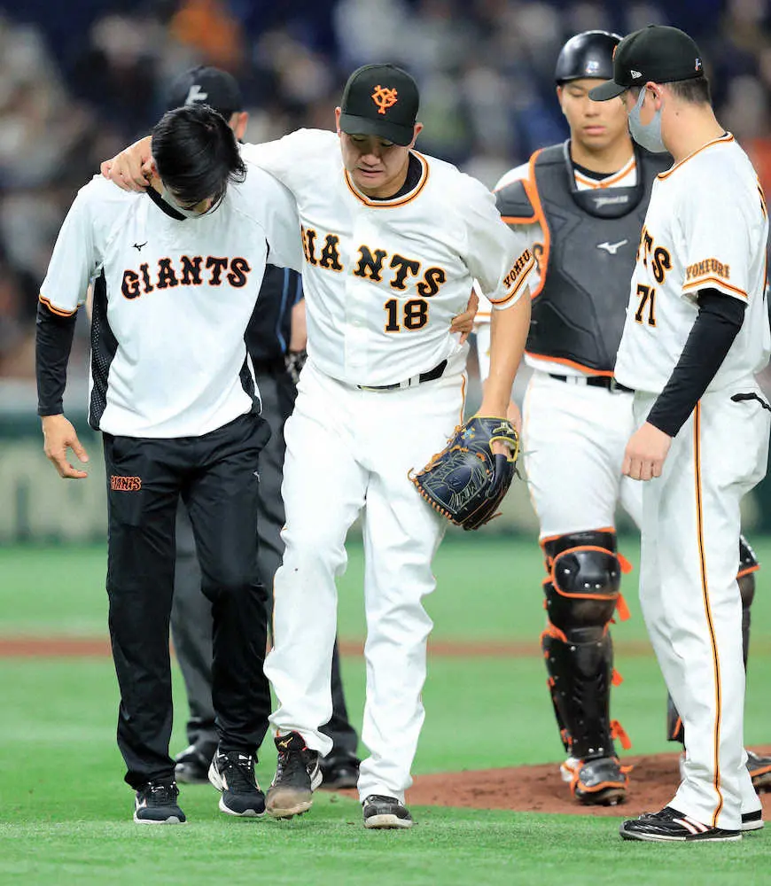 <巨・ヤ>手を借り、ベンチへと引き揚げる菅野(中央)をベンチから見つめる原監督(撮影・河野 光希) Photo by スポニチ 巨人も菅野も痛タタタ…打球が右足首付近に当たるアクシデントで緊急降板 … ギャラリーで見る この記事のフォト 2022年04月08日の画像一覧 もっと見る 2022年04月08日の画像をもっと見る
