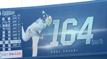 <ロ・オ(3)>3回、164キロを記録した佐々木朗(撮影・長久保 豊) Photo by スポニチ ロッテ・佐々木朗 またしても出た!!自己最速タイ164キロ ギャラリーで見る この記事のフォト 2022年04月10日の画像一覧 もっと見る 2022年04月10日の画像をもっと見る