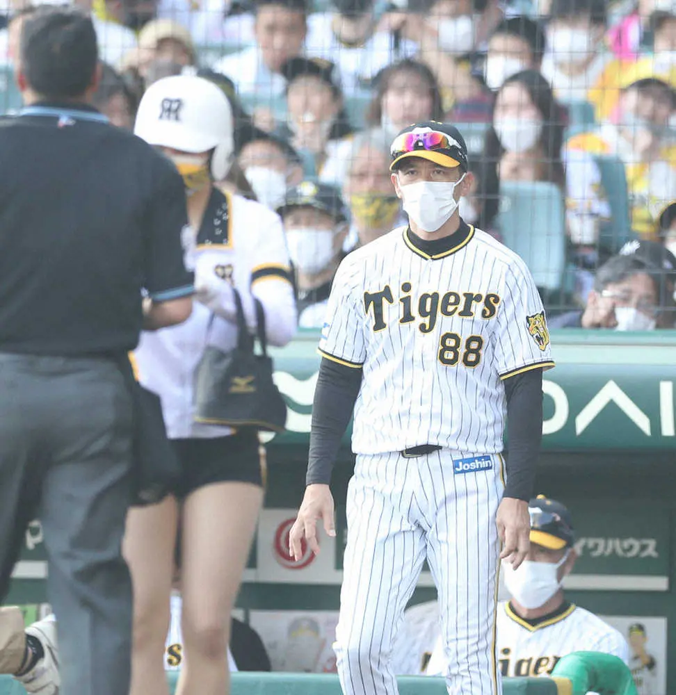 <神・広> 選手交代を告げるためベンチを出る矢野監督(撮影・大森 寛明)