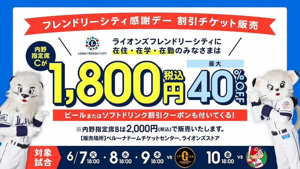 西武が6月7~9日巨人戦、10日広島戦で「フレンドリーシティ感謝デー」埼玉県内56自治体対象に割引