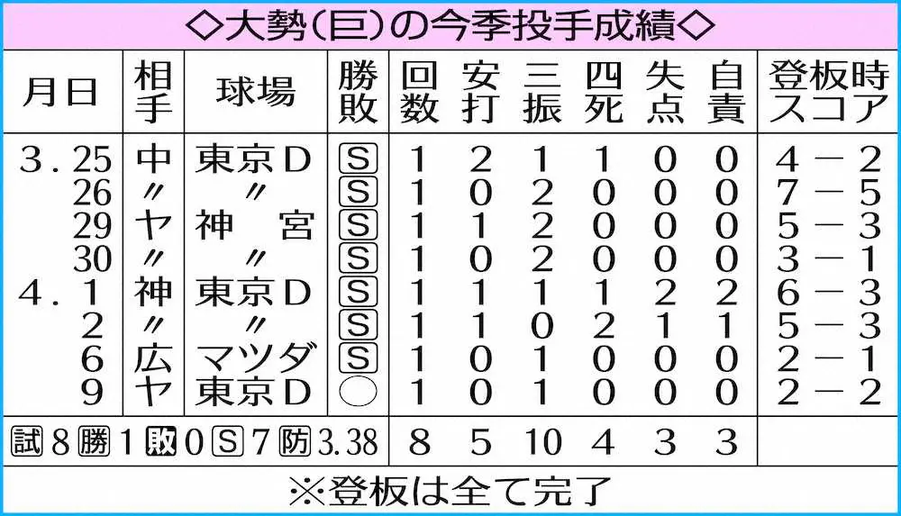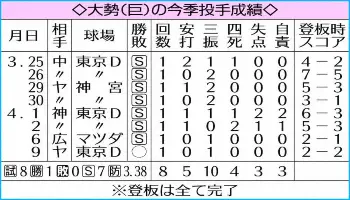 巨人の大勢 Photo by スポニチ 巨人・大勢 チーム試合数での最速10セーブなるか?15試合中8試合に登板し… ギャラリーで見る この記事のフォト 2022年04月12日の画像一覧 もっと見る 2022年04月12日の画像をもっと見る