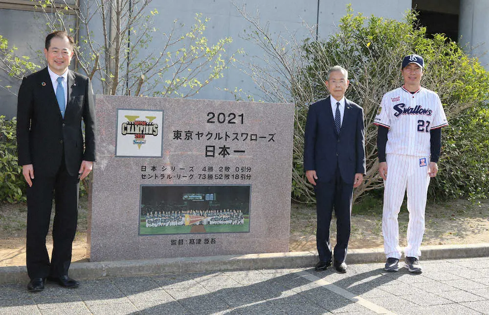 ヤクルト―広島の試合前に昨年の20年ぶり日本一を記念した石碑の除幕式が行われ、衣笠剛球団社長(73)、高津臣吾監督(53)らが出席した。