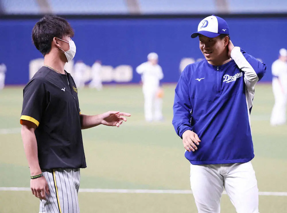 <中・神>横浜高の先輩・柳(右)と談笑する伊藤将(撮影・北條 貴史)